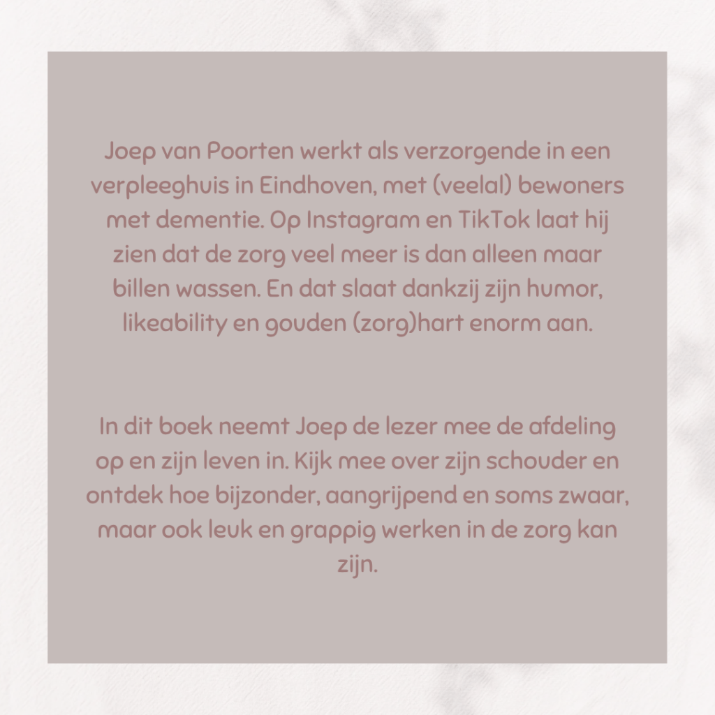 Verschillende verhalen uit het woonzorgcentrum waar ouderen met dementie wonen. Broeder Joep is verzorgende op de dienst en beleeft heel wat met de bewoners. In dit boek verzamelt hij deze avonturen. Grappig, ontroerend, maar bovenal met veel liefde voor de zorg.