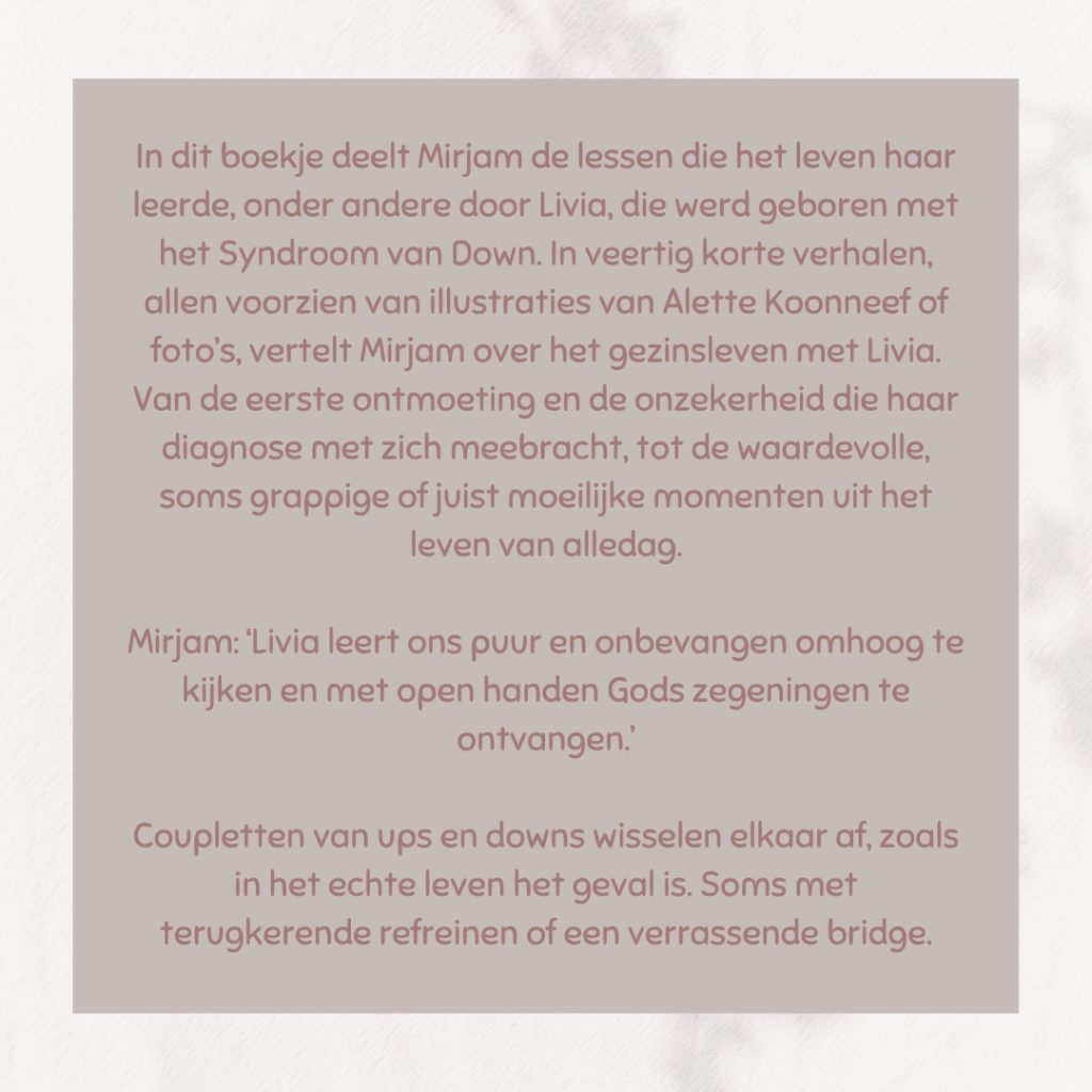 Mooi, puur en inspirerend boek waarin Mirjam Kooijman 40 korte verhaaltjes vertelt over het leven met hun prachtige dochter Livia, die geboren is met het syndroom van Down. Elk verhaaltje wordt aangevuld met een foto of een tekening.