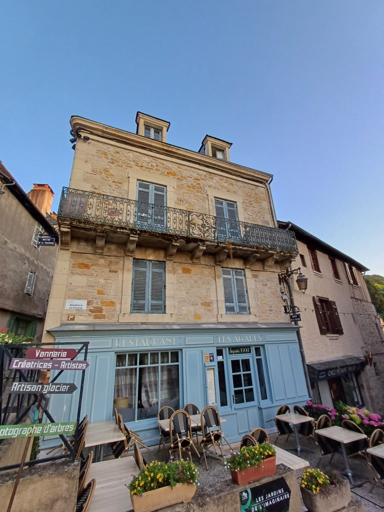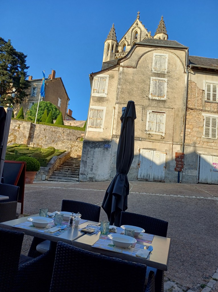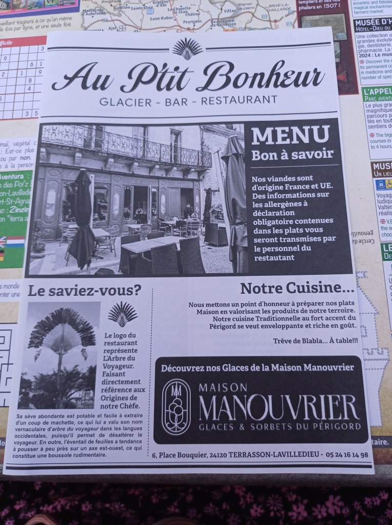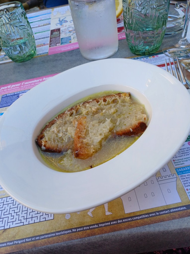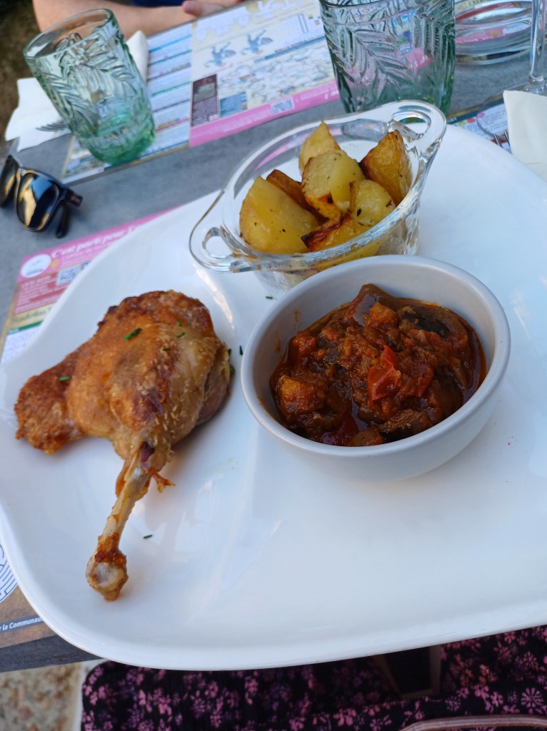 Op de laatste avond zijn we gaan uiteten in het stadje. Het restaurantje is gelegen op een pittoresk pleintje vlak bij de kerk. We kregen gratis knoflooksoep en zelfs het frisse (kraan)water werd regelmatig aangevuld. Ik at een confit de canard, dat samen met ratatouille en aardappeltjes geserveerd werd. Als dessert at ik een ijsje met een bol ‘rose’ (roos) en een bol ‘jasmin’ (jasmijn). Ik heb heel lekker gegeten. En voor ons vieren waren we maar 125,00 euro kwijt. Echte aanrader!