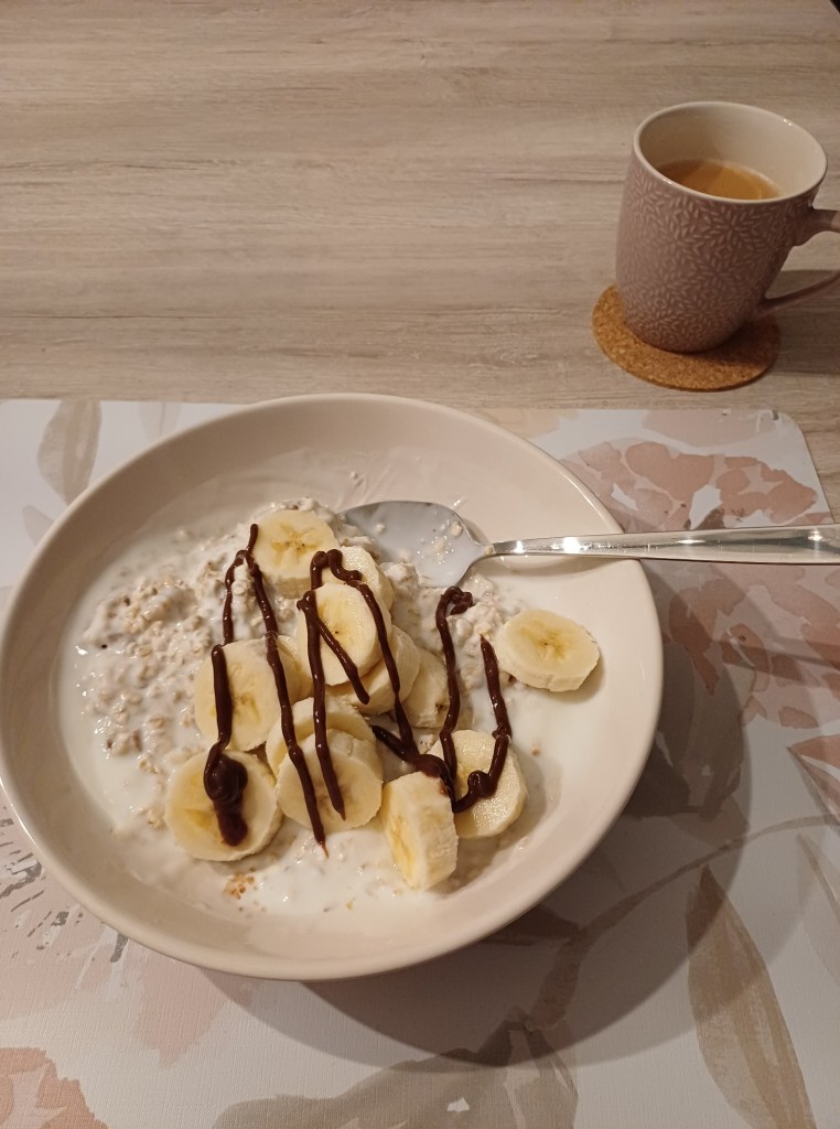 • Mijn standaardontbijtje: havermout, magere yoghurt, banaan en Callowfit chocoladesaus met een koffietje.