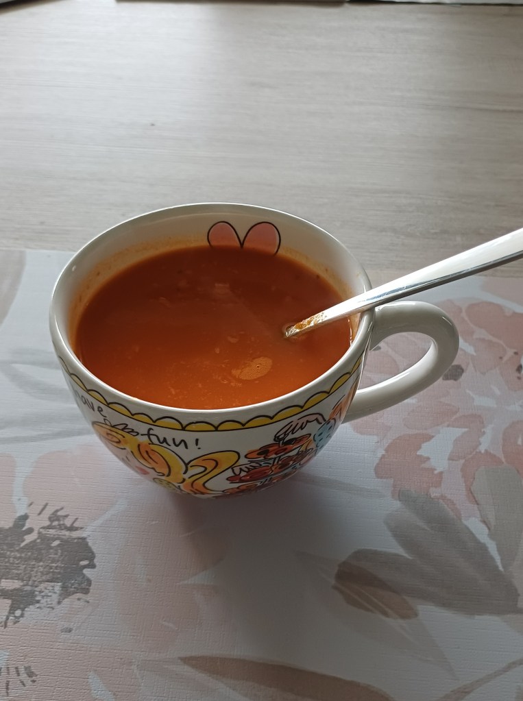 • Tomatensoep met balletjes. Niet zelf gemaakt, maar ‘vers gemaakt’ door AH.