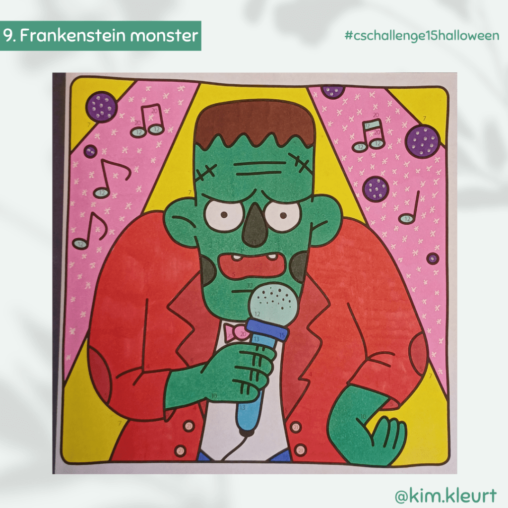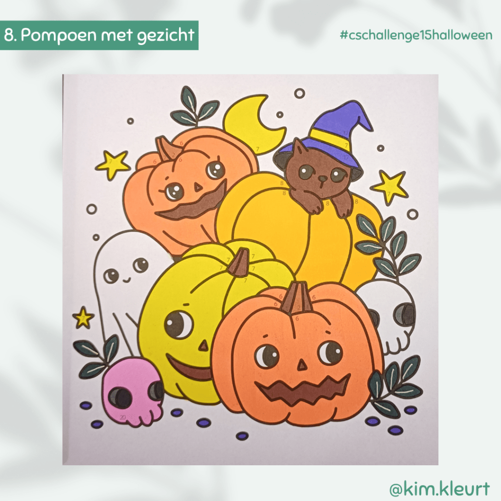 Het was weer een leuke challenge om te doen. Ik heb weliswaar niet veel met Halloween en doe er ook niet aan mee (in de zin van verkleden, huis versieren,…). De pompoenen en de schattige dingen vind ik nog oké, maar de skeletten, afgehakte ledematen, bloed, … hoeven voor mij niet. Gelukkig is de volgende challenge al aangekondigd, veel vrolijker, en ik ben al aan het vooruitkleuren. 🙂