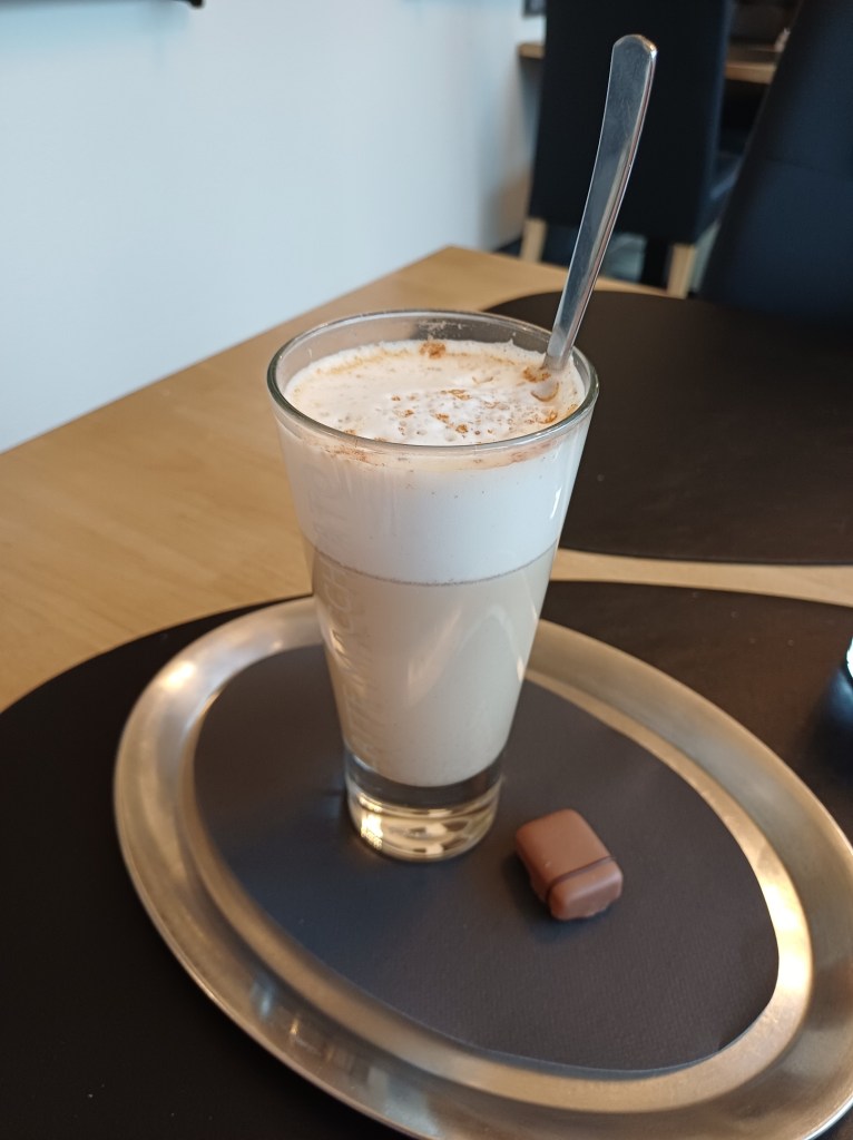 Het was de eerste keer dat ik een chai latte dronk. Dit is thee met melk en verschillende kruiden. Ik proefde voornamelijk de gember en de kaneel. Het was best te drinken, maar ik zou het de volgende keer niet meer nemen.