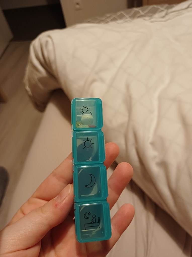 - ’s Avonds wilde ik mijn slaappil innemen. Toen kwam ik tot de conclusie dat ik mijn slaappil ’s morgens had ingenomen en mijn pillen van in de ochtend niet. Uiteindelijk was het niet erg, maar het hoeft geen tweede keer te gebeuren.