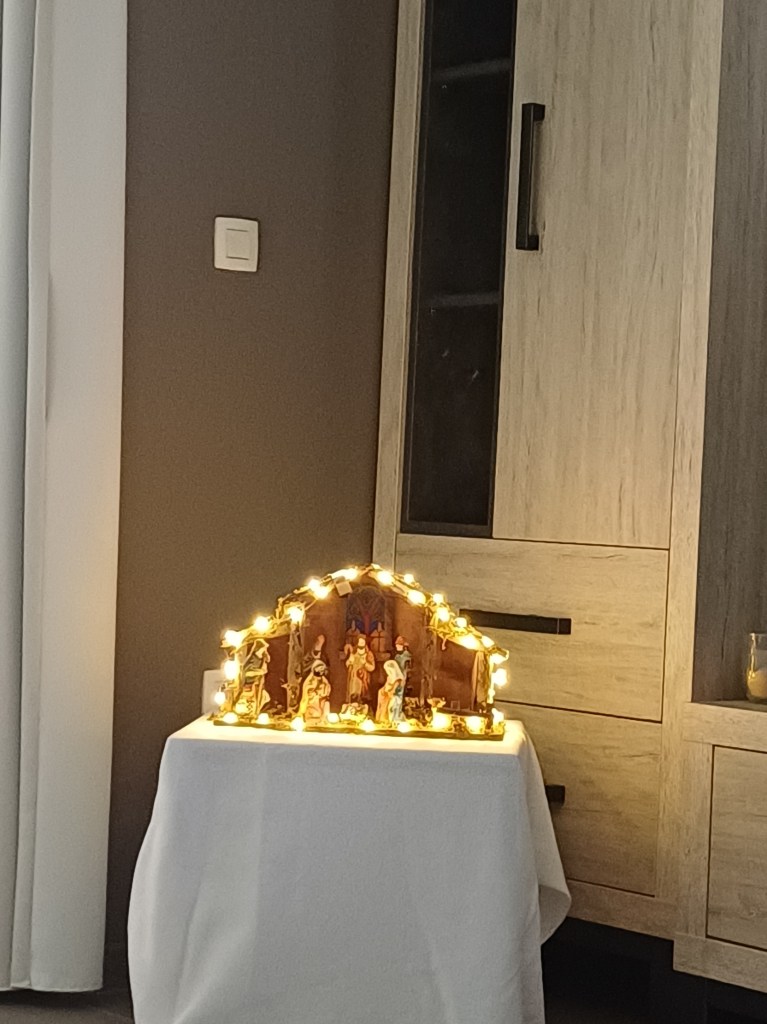 Mijn appartementje is versierd. Niet al te veel. Het hoeft ook niet Amerikaanse kitsch te worden. Leuk in films, maar niet in mijn appartement. De adventskrans en de kerststal heb ik via Vinted gescoord.