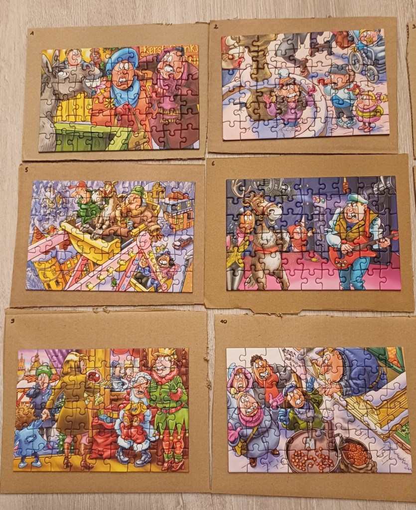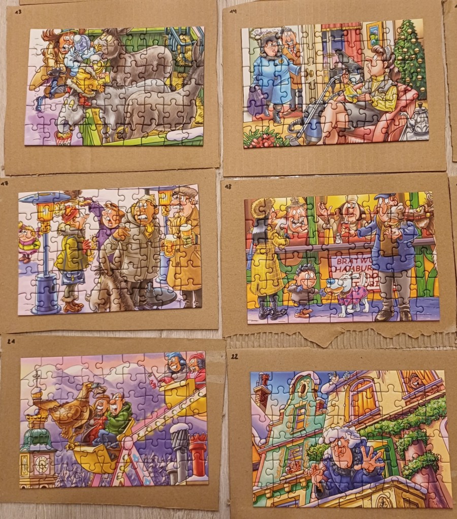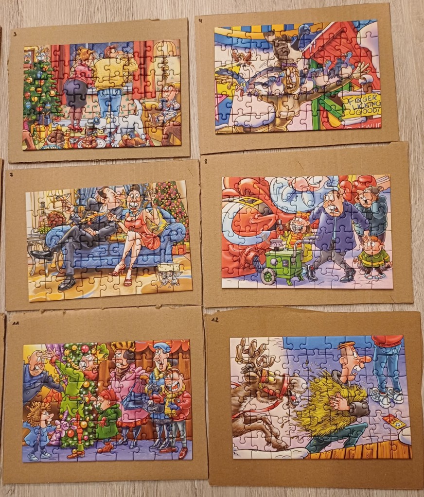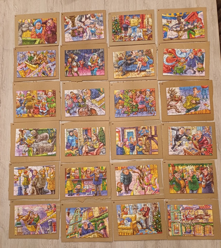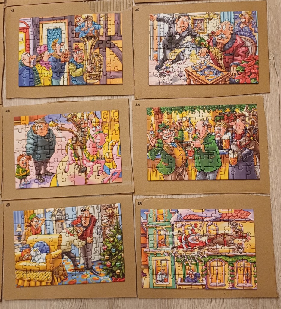 Voor de puzzeltjes had ik op voorhand 24 kartonnen platen op maat gesneden. Zo kon ik het netjes opbergen zonder af te breken en kon ik de puzzeltjes ook opstapelen.