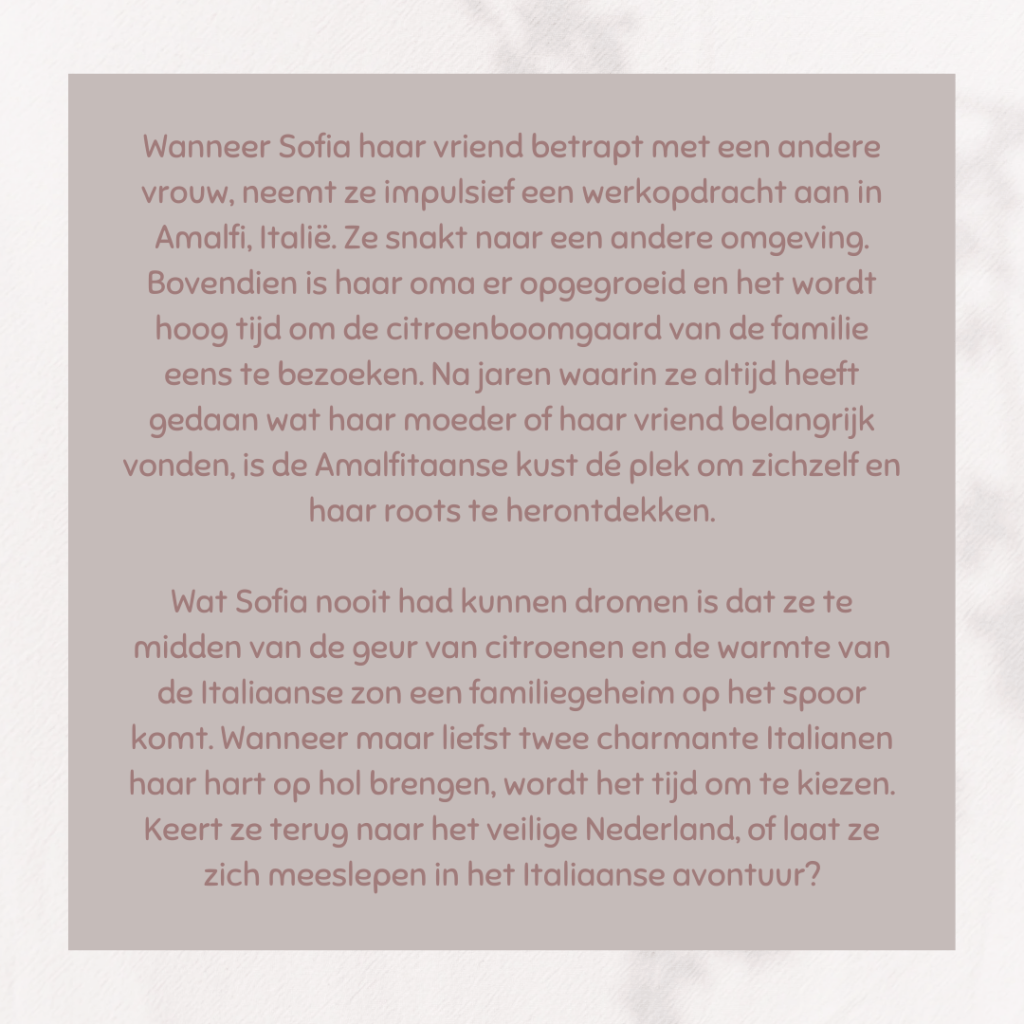Deze zomerse feelgood brengt je meteen in vakantiestemming. Door de beeldende schrijfstijl en de vele lokale weetjes waan je jezelf in Amalfi. Ik heb genoten van het verhaal.