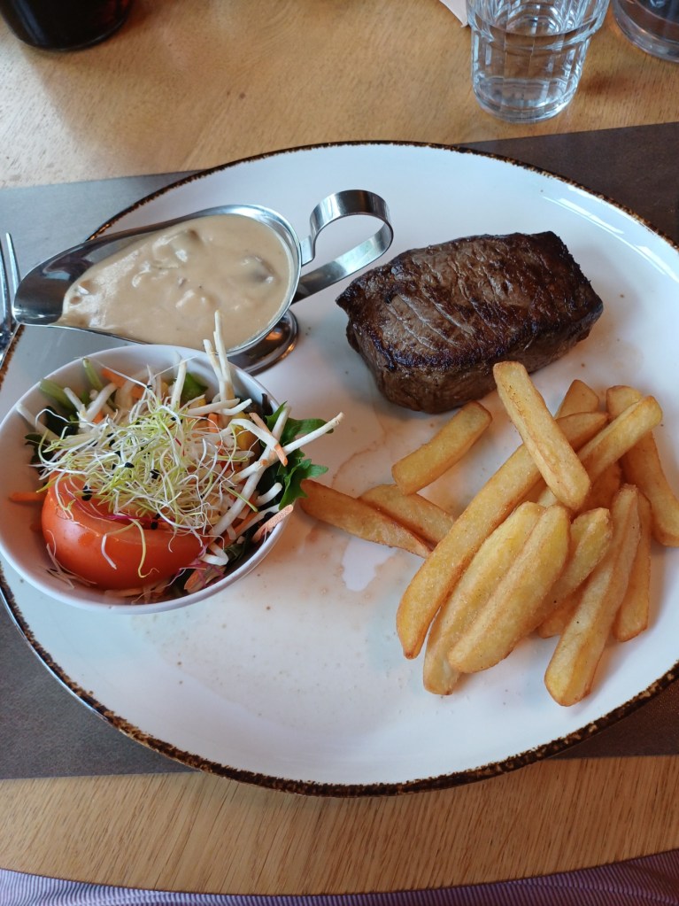 Tournedos met een slaatje, frietjes en champignonsaus