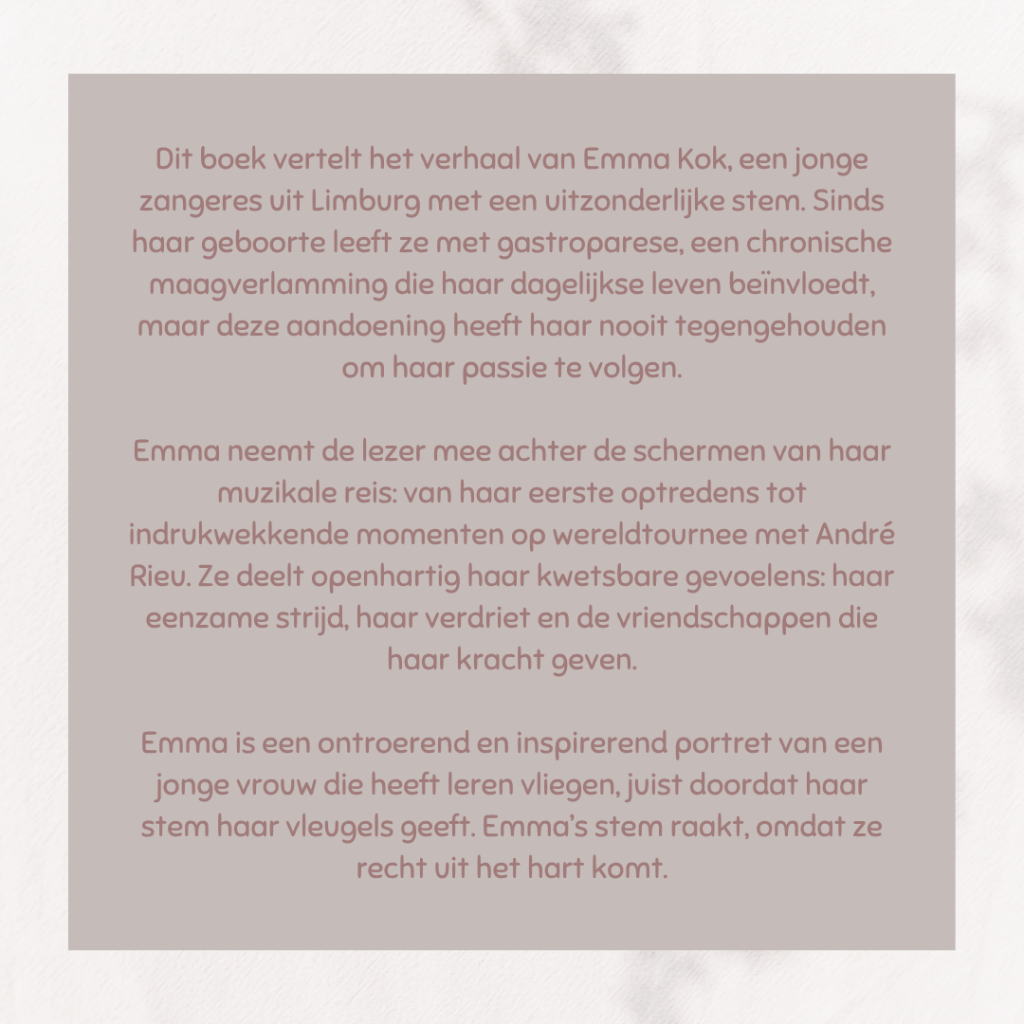 Emma lijdt aan gastroparese (verlamming van de maag) en dit beïnvloedt haar leven enorm. In haar boek wordt er uiteraard aandacht aan besteed.