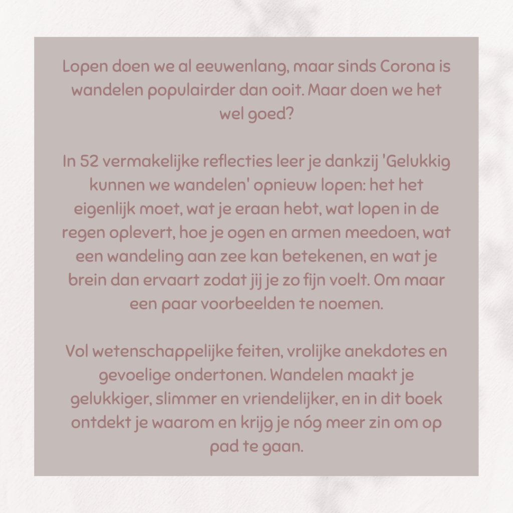 Soms begin je aan een boek en valt het je wat tegen. Dat had ik bij dit boek. Annabel Streets heeft heel veel onderzoek gedaan en daar kan ik enkel bewondering voor hebben. Ze doorspitte de wetenschappelijke literatuur over wandelen en goot het in 52 korte hoofdstukken oftewel weken. Ik las ze achter elkaar, waarvan het tweede deel vooral diagonaal. De samenvattingen van die wetenschappelijke literatuur begon me tegen te steken. Misschien zal het anders aanvoelen als je het boek werkelijk 52 weken (1 hoofdstuk per week) leest, maar daar heb ik het geduld niet voor.