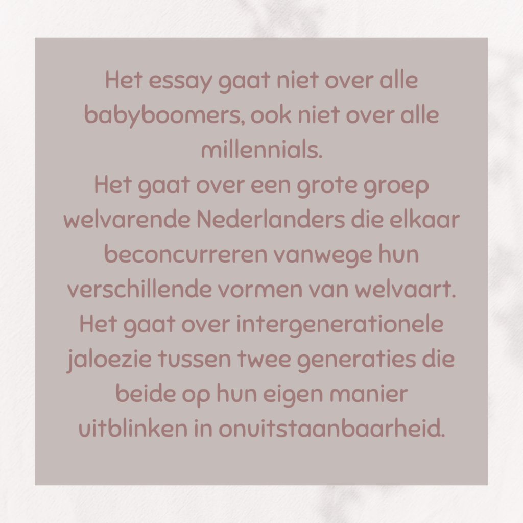 Interessant essay over de generatiekloof, vooral tussen babyboomers en millenials. Het essay is gebaseerd op de Nederlandse staat, maar is ook van toepassing op België en meerdere Westerse landen. Er staan veel herkenbare dingen in. De slotzin vond ik heel goed gevonden: “De echte elite maakt zich niet druk over hoge huizenprijzen.”