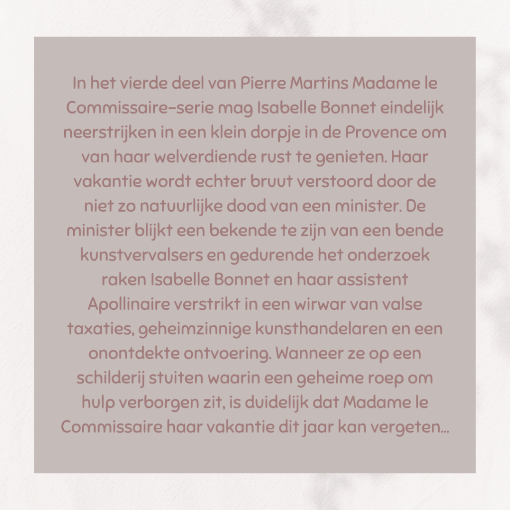 Wat geniet ik zo van deze serie! Met elk boek dat ik lees, ga ik meer van de personages houden. In dit deel blijft het lange tijd mysterieus, maar op het einde beginnen de puzzelstukken ineen te vallen. Dit verhaal is weer een aanrader als je houdt van cosy crime, la douce France en een hele sterke vrouw als hoofdpersonage.