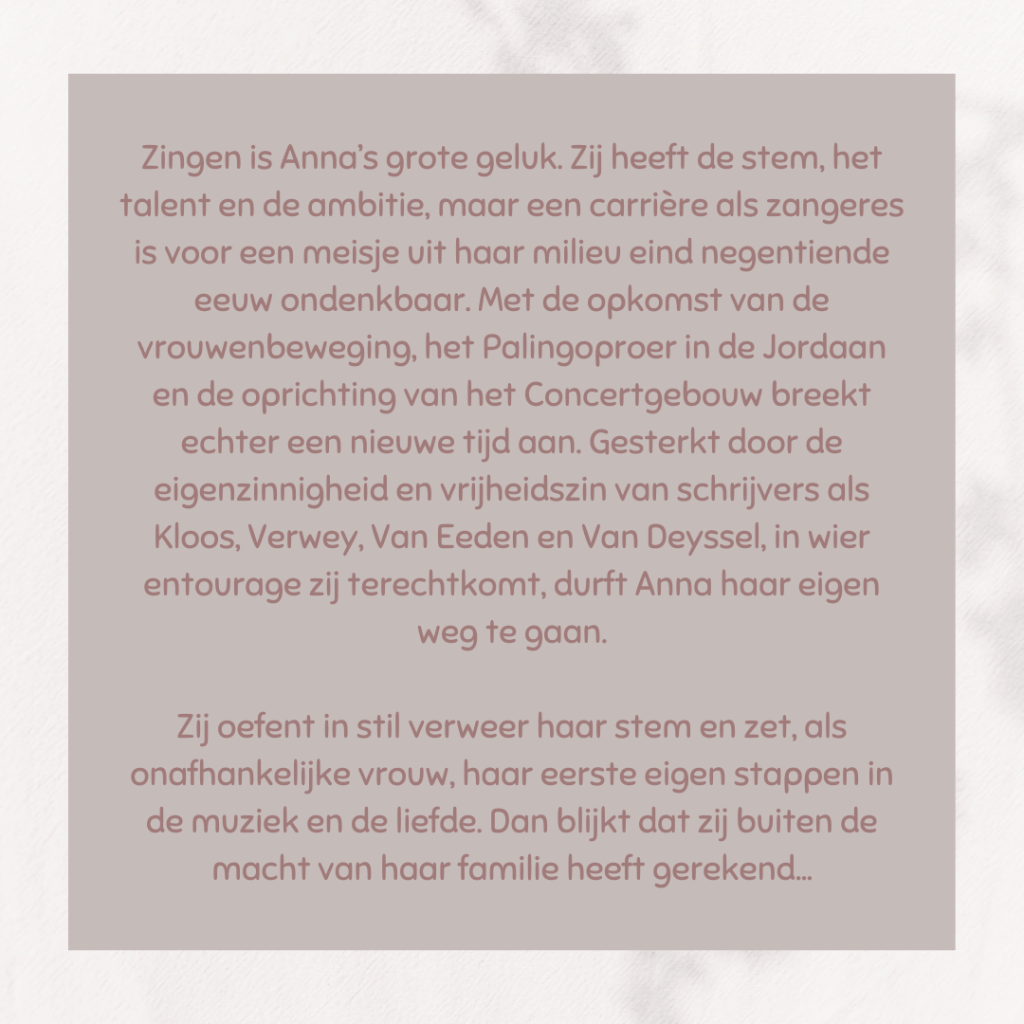 Binnenkort is het weer de leesclub in de bibliotheek. Deze keer is er gekozen voor dit boek van Arthur Japin. Het boek is gebaseerd op het leven van Anna Witsen. Zij leefde in de tweede helft van de 19de eeuw in en rond Amsterdam en was geboren in de hogere klasse. Ze was sopraan en hield zielsveel van zingen. Echter werd ze tegengehouden omwille van haar achtergrond.